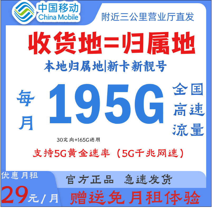 29元192G通用流量【本地归属、流量结转、可开副卡、千兆速率】